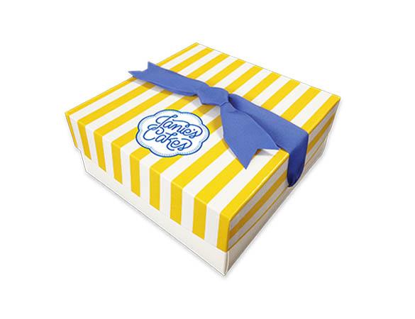 - Every Janie's Cake is packaged in our signature yellow and white striped box with a blue ribbon.