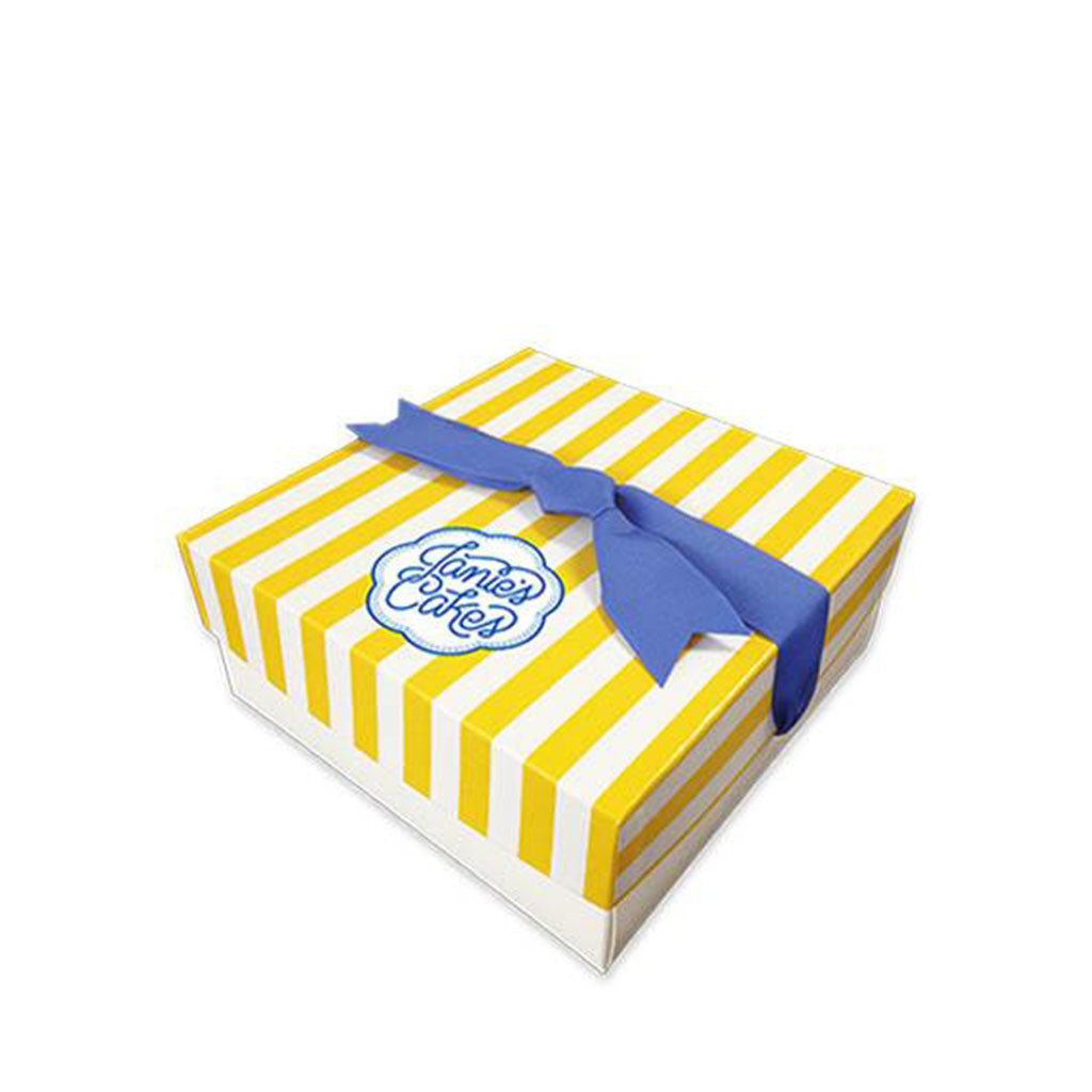 - Every Janie's Cake is packaged in our signature yellow and white striped box with a blue ribbon.