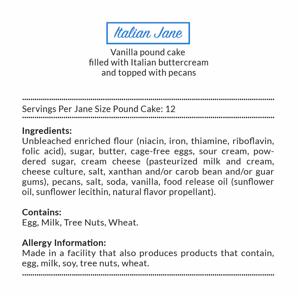 - Every Janie's Cake is packaged in our signature yellow and white striped box with a blue ribbon.